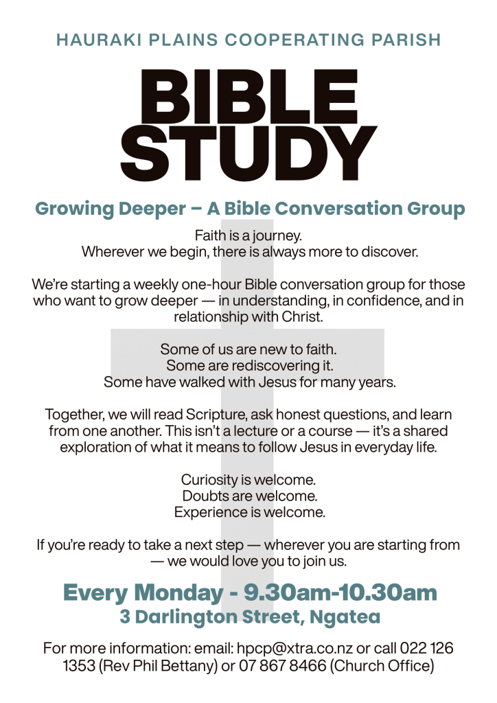 We are a Christian community serving the Hauraki Plains, sharing life and worship together as a co-operating parish of the Anglican, Methodist, and Presbyterian Churches.